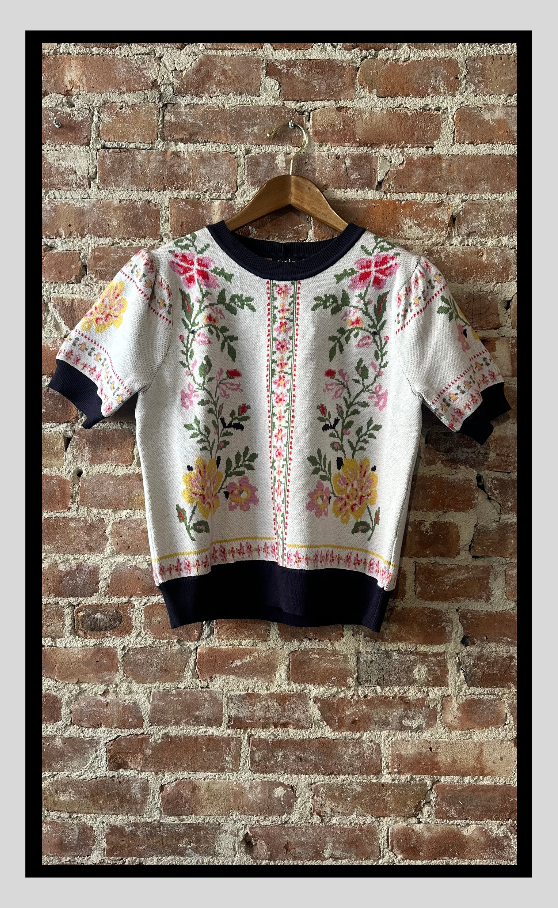 A joyful blend of comfort and color, this short-sleeve sweater features a vintage-inspired floral jacquard pattern in rich hues of yellow, rose, and green. The soft ivory base is trimmed with contrasting navy ribbing at the collar, cuffs, and hem for a polished finish. Slight puff sleeves add a playful touch to this standout piece—perfect for pairing with denim or a pleated skirt.