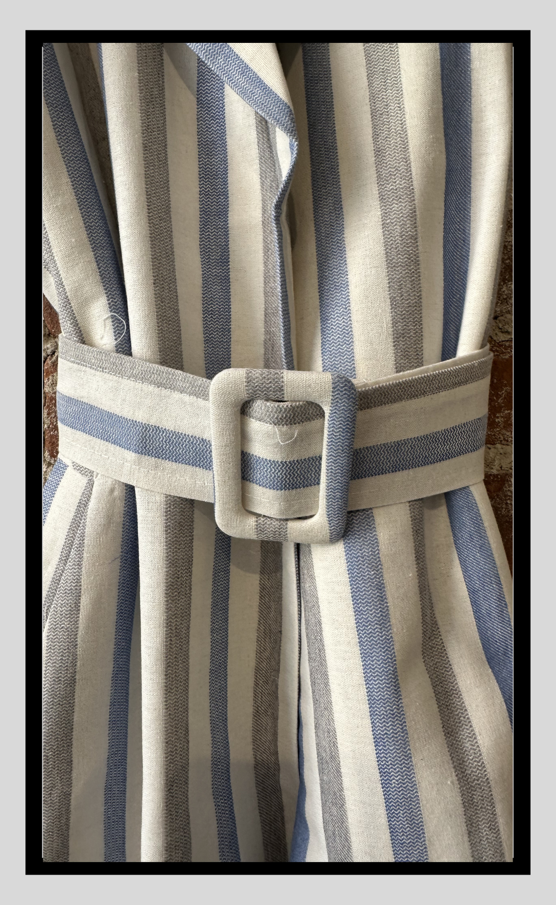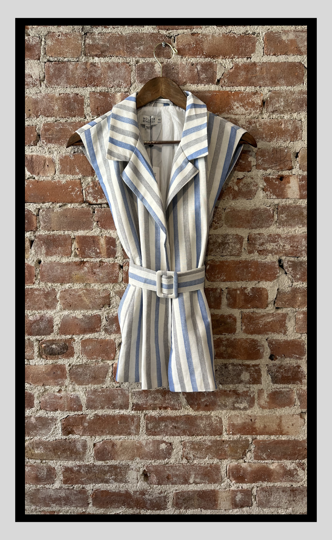 Effortlessly polished with a relaxed coastal feel, this sleeveless striped vest features a soft structured silhouette, wide lapel collar, and a matching belt with fabric-covered buckle to define the waist. Designed in a breathable cream base with blue and grey vertical stripes, it layers beautifully over dresses, tees, or lightweight knits. A chic transitional piece that adds instant sophistication to both casual and elevated looks