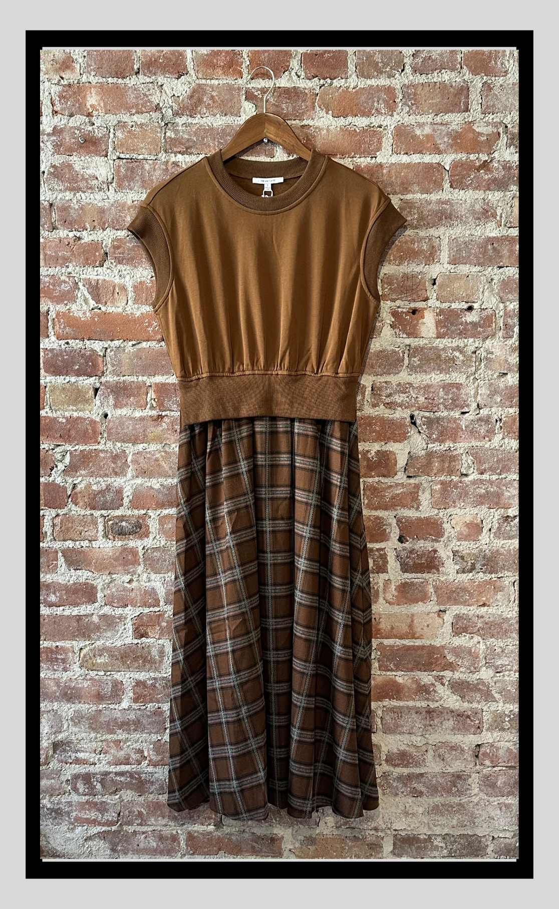 A cozy blend of comfort and charm, this dress pairs a soft, cocoa-toned knit bodice with a flowing plaid skirt in coordinating earthy hues. The gently gathered waist creates a flattering silhouette, while the cap sleeves and crew neckline add a casual, modern touch. Perfect with boots or sneakers for an effortlessly put-together look.
