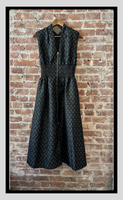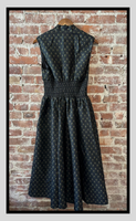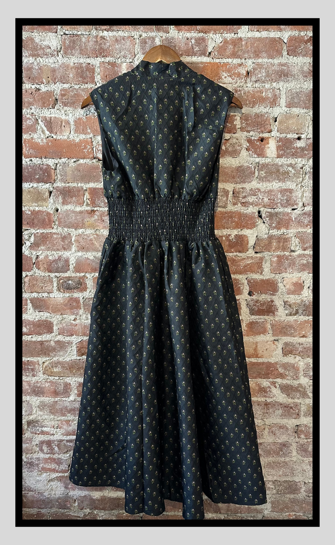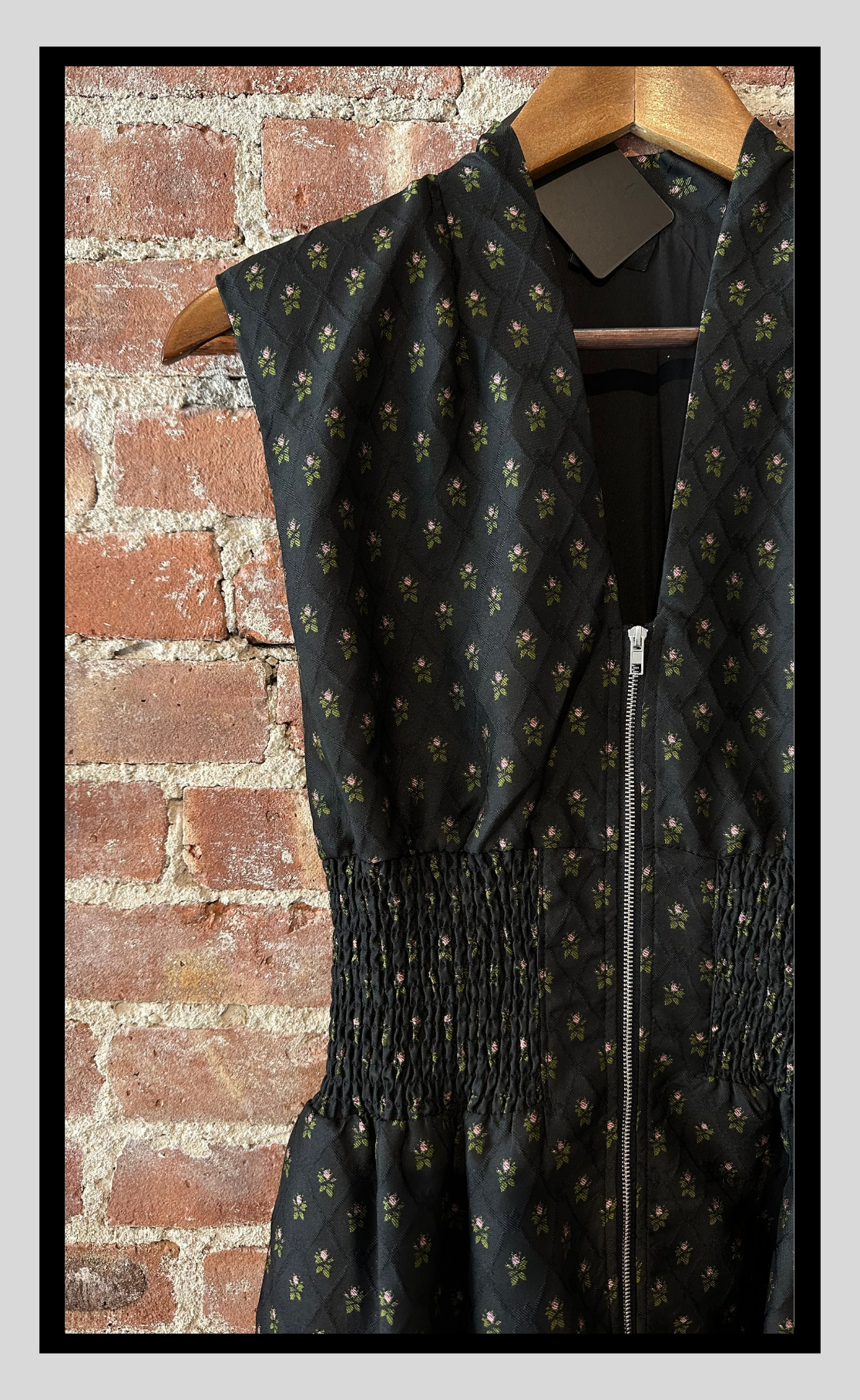 Effortlessly elegant, this sleeveless midi dress features a deep V neckline, front zip closure, and a flattering smocked waist for a cinched silhouette. Finished with a delicate all-over print, it’s the perfect mix of modern edge and timeless charm.