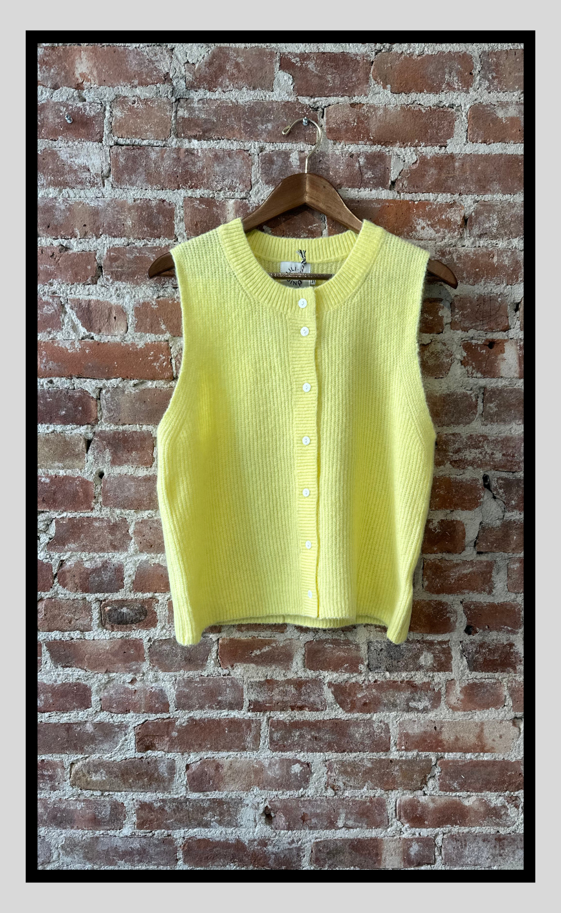 Brighten your day with this lemon-hued sleeveless cardigan. Featuring a classic round neck and tonal buttons, it’s a playful piece that adds charm to any casual ensemble.