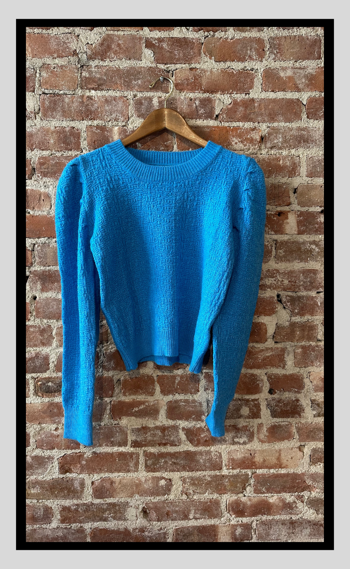 Bright, bold, and beautifully cozy. This electric blue sweater features a unique textured knit and subtle puffed shoulders for a flattering, feminine shape. With its fitted hem and soft stretch, it adds a vibrant pop to your everyday layers. Pair it with high-waisted denim or tuck it into a midi skirt for a polished twist.
