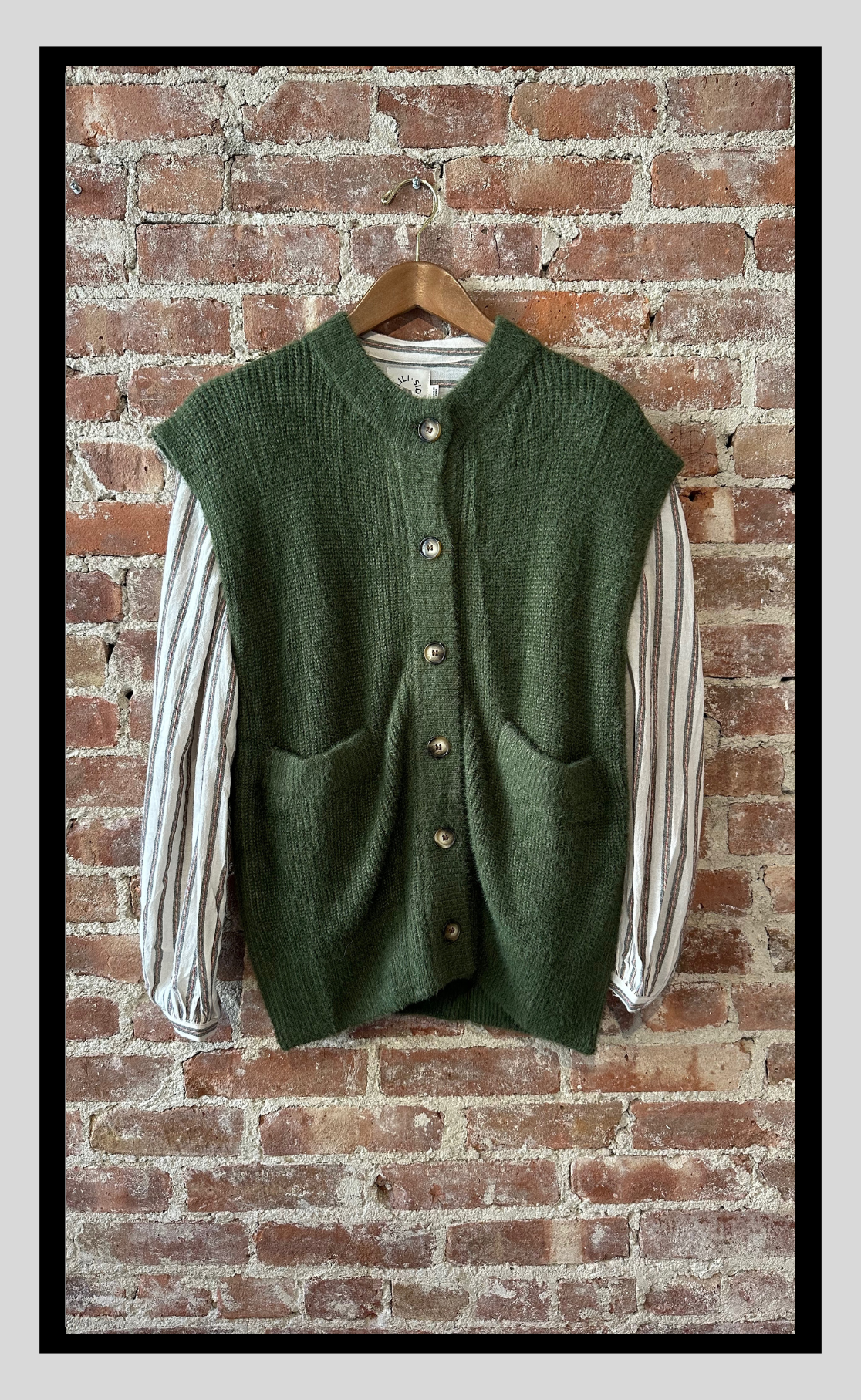 Soft and structured, this moss green vest is a layering essential with rustic charm. Designed with wide shoulders, front patch pockets, and a chunky button-down closure, it adds both texture and warmth to any outfit. Wear it over blouses, dresses, or fitted knits for an effortlessly styled look.