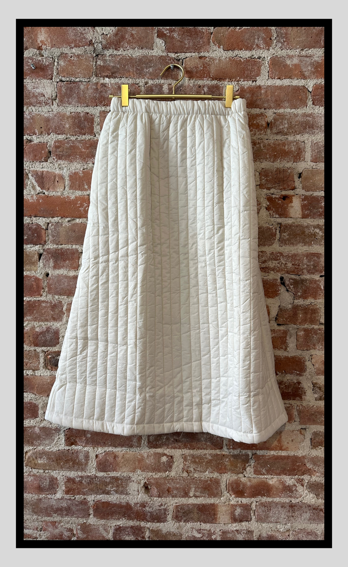 Warmth meets elegance in this mid-length quilted skirt, crafted in a soft cream tone with subtle vertical stitching for added structure and texture. The elastic waistband offers comfort and ease, while the gently flared silhouette creates a flattering, modern shape. A unique piece that blends functionality with refined style—perfect for transitional layering.