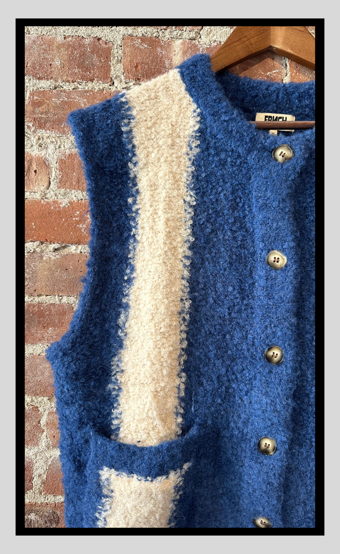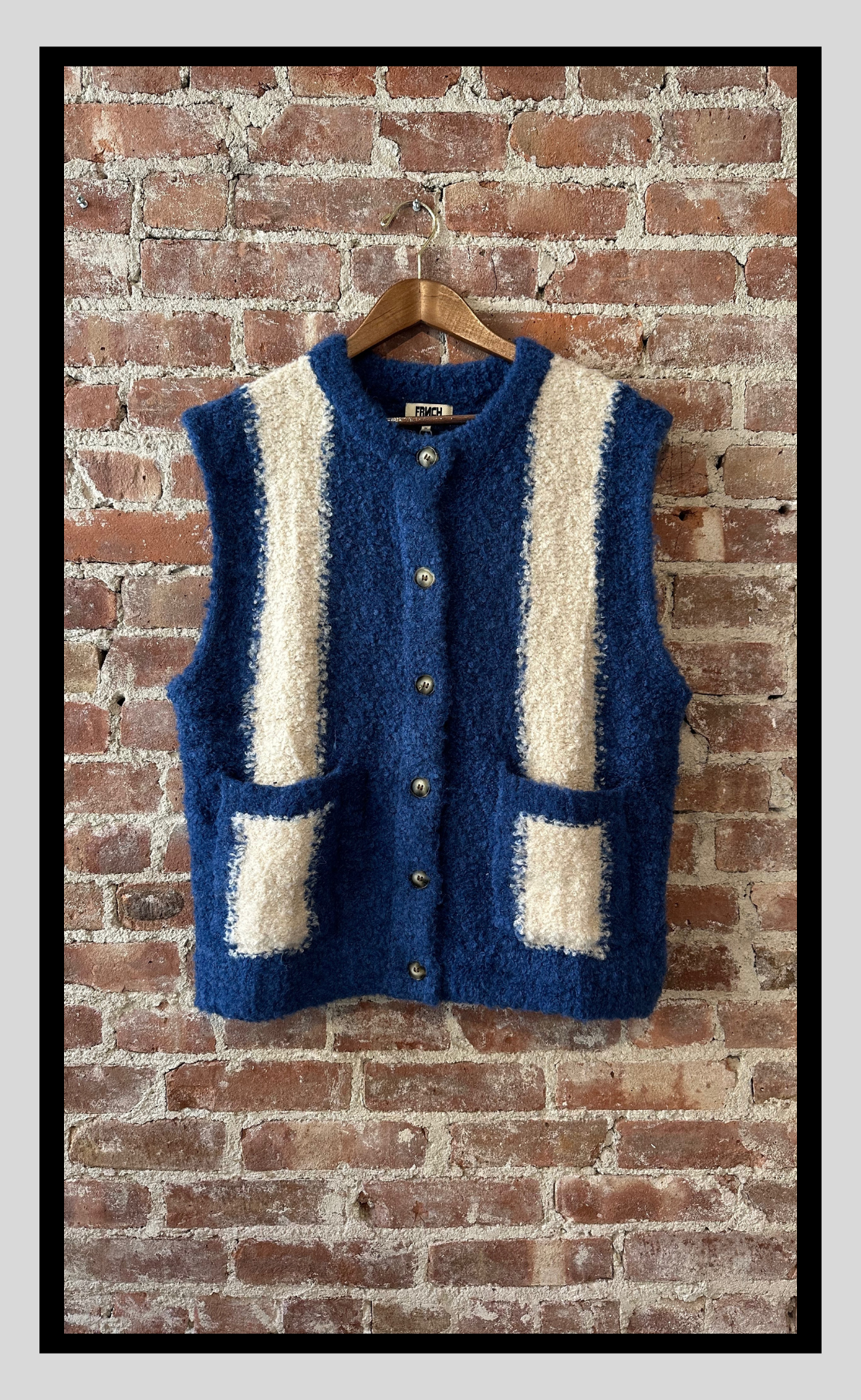 A statement piece that blends texture with timeless charm. This sleeveless knit vest in deep bleu marine is accented with bold crème stripes, adding both structure and contrast. Crafted in a boucle-style weave, it offers cozy softness with a touch of vintage Parisian flair. Finished with practical front pockets and tonal buttons, it’s the perfect layering piece to elevate simple shirts or dresses.