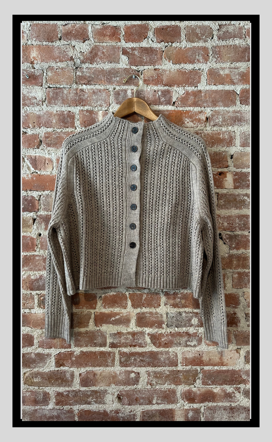 A cozy essential with timeless appeal. This taupe knit sweater features a button-up front, textured detailing, and a flattering cropped fit—perfect for layering or wearing on its own for a relaxed yet chic look.