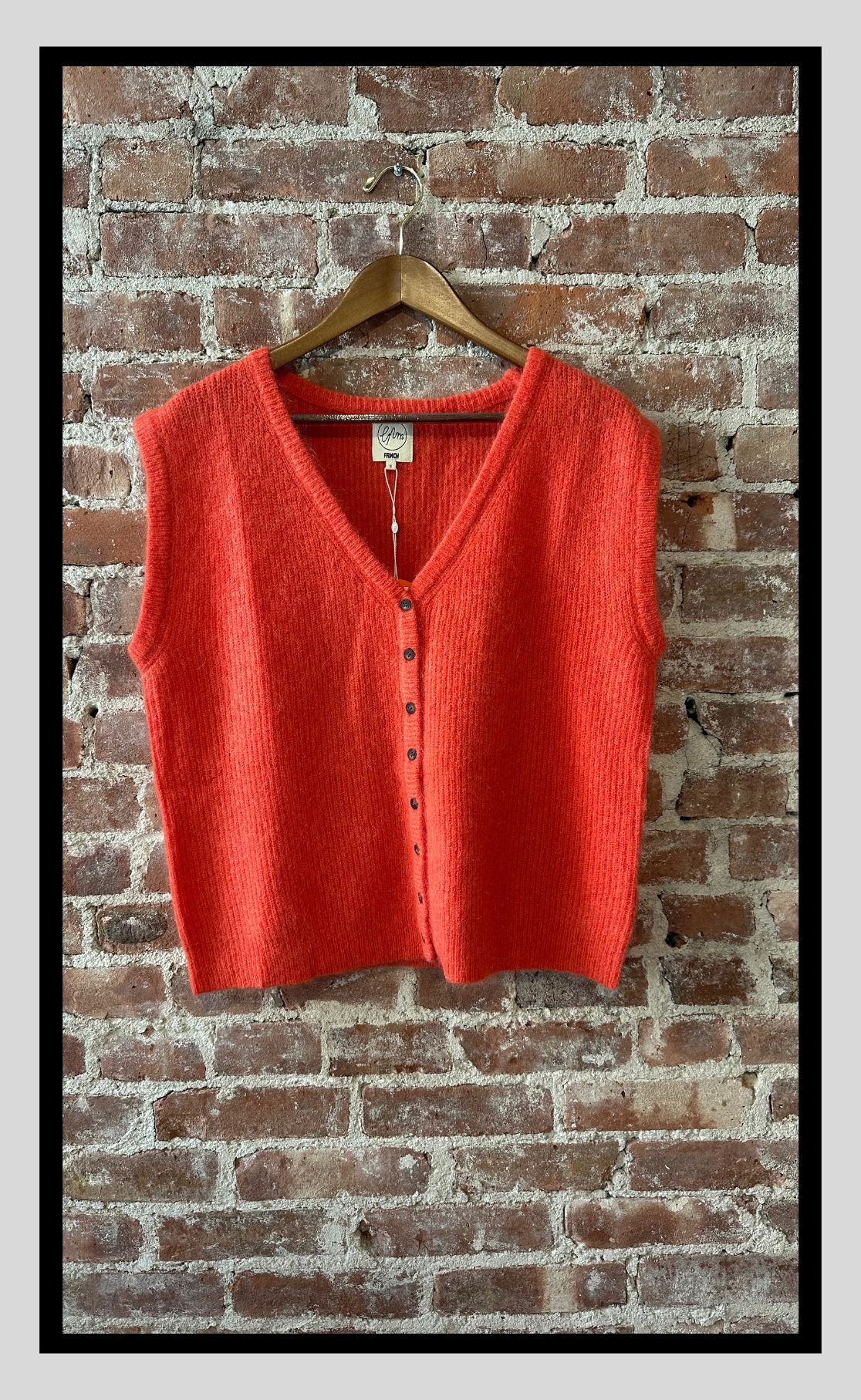 A cozy standout in a rich rouge hue, this sleeveless knit vest brings warmth and vibrance to cooler days. Made from a soft wool blend, it features a V-neckline, front button closure, and a slightly cropped, boxy silhouette—ideal for layering over shirts, turtlenecks, or dresses. Bold yet timeless.