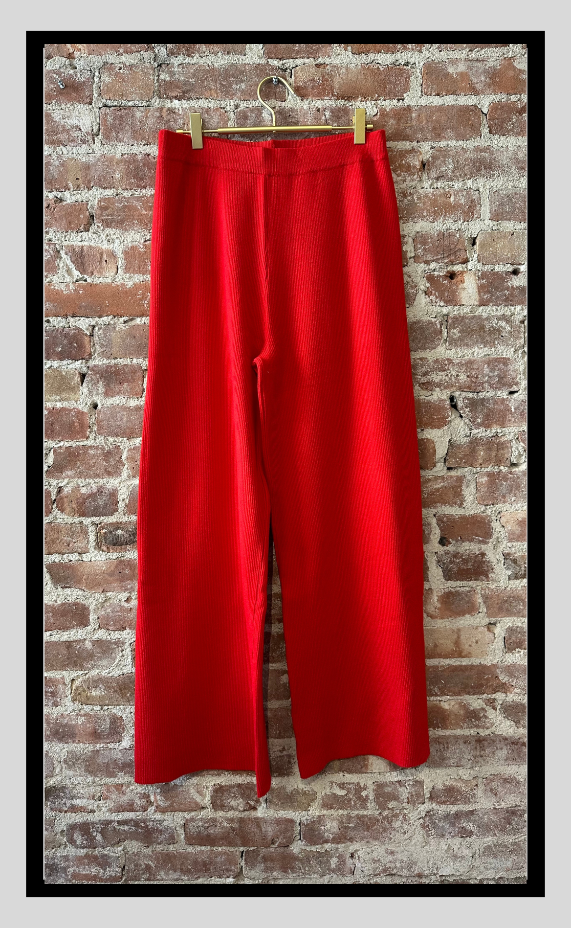 Bold and cozy, these rouge sweater pants are made from a soft, stretchy knit that moves with you. Designed with a flattering high waist and a wide-leg silhouette, they offer comfort without sacrificing style. Pair them with the matching collared sweater or mix and match for a statement look that feels as good as it looks.
