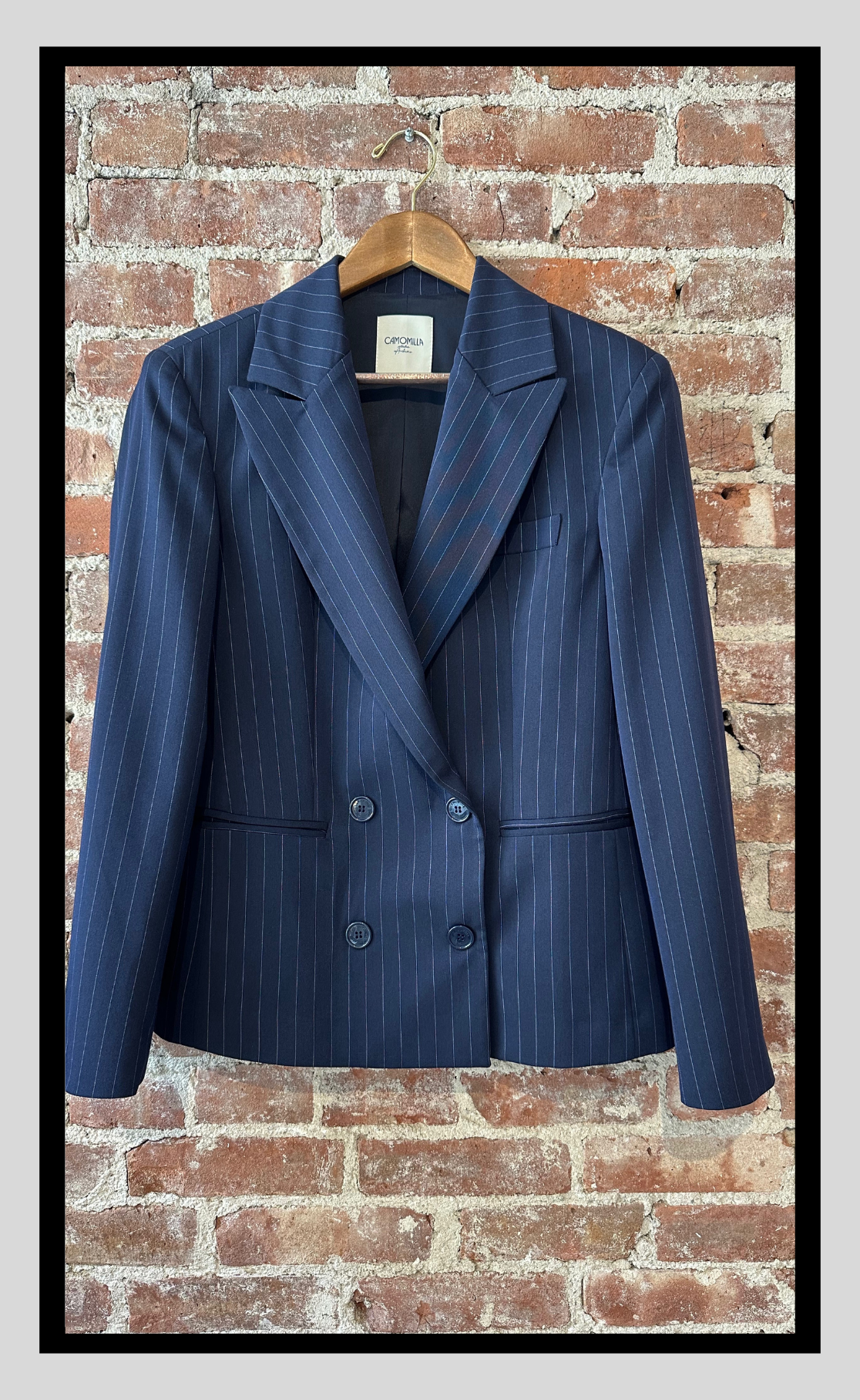 Sharp and sophisticated, this double-breasted blazer in navy with fine pinstripes is a timeless wardrobe staple. Tailored for a flattering fit, it pairs effortlessly with matching trousers or a skirt for a polished, modern look.