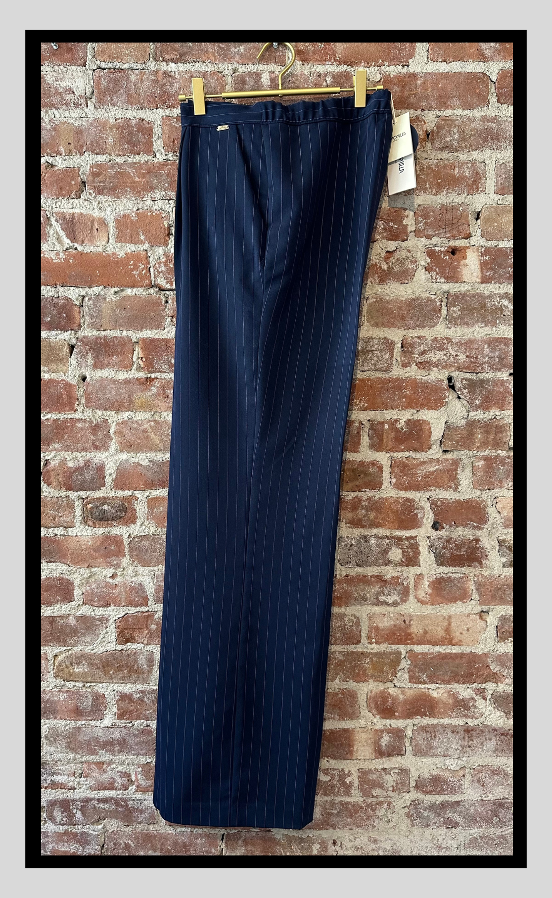 Classic yet modern, these navy palazzo pants feature subtle vertical stripes that elongate the silhouette. With a relaxed wide-leg fit, they’re perfect for effortless sophistication—whether styled for the office or an elevated casual look.