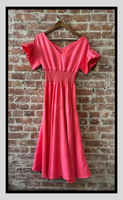 Brighten up your wardrobe with this coral smocked midi dress. Featuring a flattering smocked waist, flutter sleeves, and a flowing skirt, this dress is the epitome of effortless femininity and comfort.